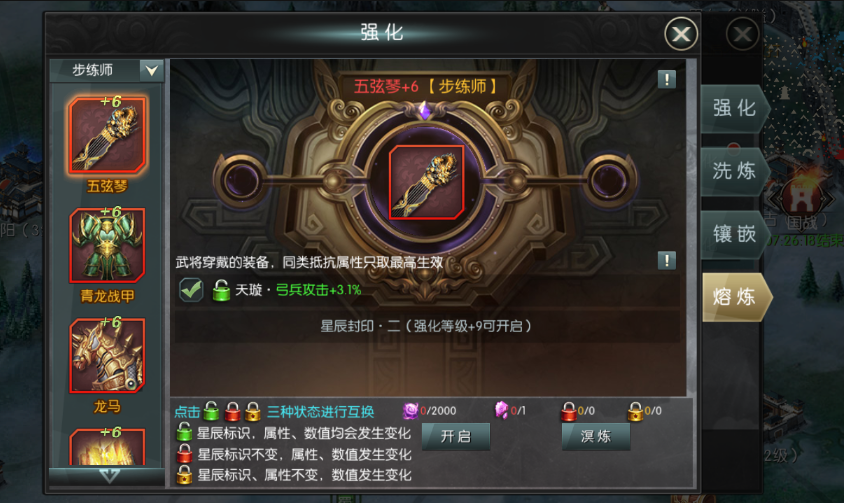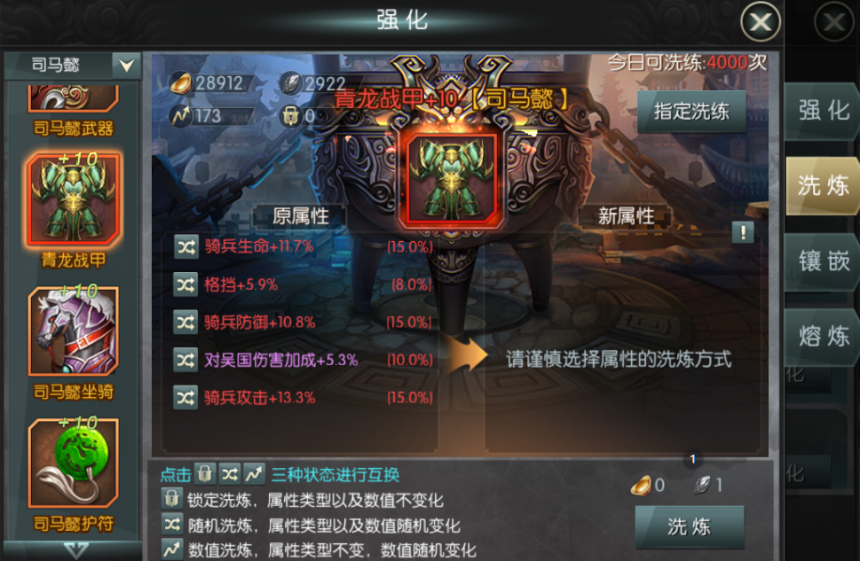 2. 洗练属性中有三个属性必须为兵种的加成,这三个就是对应你的武将所带的兵种,分别有(骑兵,弓兵,步兵)一定要洗练到你相对应的兵种,若你的武将带的是骑兵,就一定要把4件装备洗练到骑兵的加成,给武将最大值的(生命,防御,攻击加成)。
