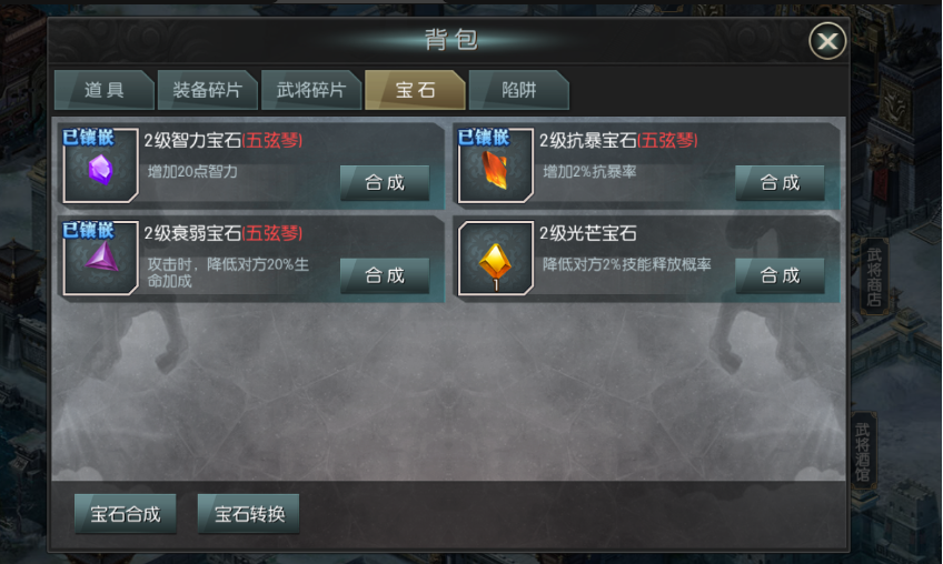宝石:优先(技能释放属性宝石,攻击宝石,元素宝石,暴击宝石)输出武将的技能一定要每个回合都能释放。