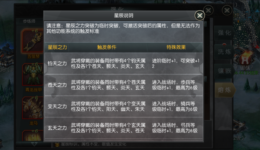 当武将装备上触发条件的拥有星辰之力的装备套装时,就可以获得特殊效果,不同的触发条件拥有不同的特殊效果。