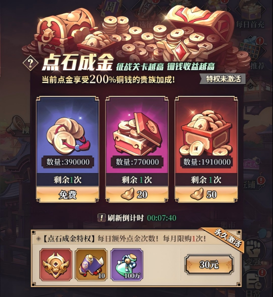1. 点石成金建议每天尽量刷满,每天的刷新时间为0点、8点及16点,这是增加游戏内铜钱的一个必要途径哦,而铜钱在游戏内许多系统中都是相当重要的呢~