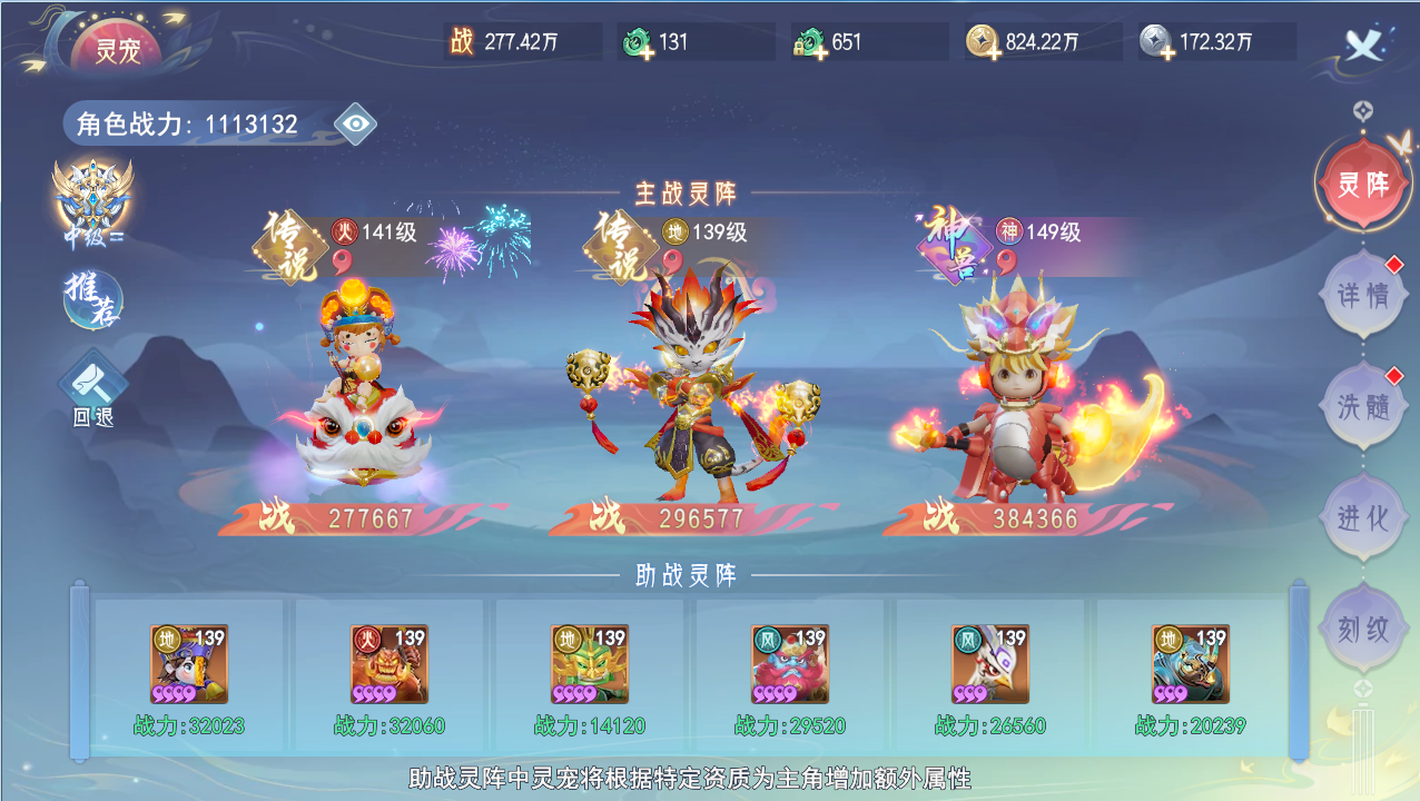 特别注意:主阵灵宠升星材料不足的时候,可以考虑把助战灵宠作为材料使用,主战灵宠的技能提升与属性提升的作用是大于战力提升的