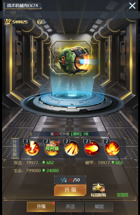 ④ 【升级】:消耗机壳配件提升机壳的等级,等级越高给主角增加的属性越多,等级提升还能激活及提升时装技能等级。