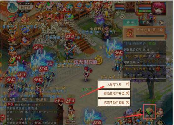 直升到180级之后在获取经验也是无法再升级,届时需要进行飞升才能突破升级上限。根据图二直接点击即可。