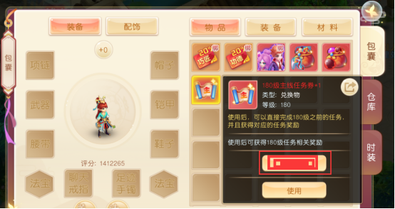 4、在飞升完成之后打背包找到直升180级的主线任务券道具使用,这个道具是直接把你1~180的主线全部完成,使用这个道具大概能获取15级左右。(记住什么都不用干直接走下面的流程)