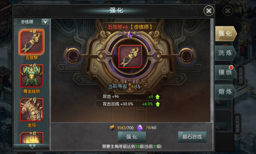 装备强化到+2、+4、+6、+8时,可以分别开启一个宝石镶嵌孔,镶嵌宝石可以大大增强武将的属性。