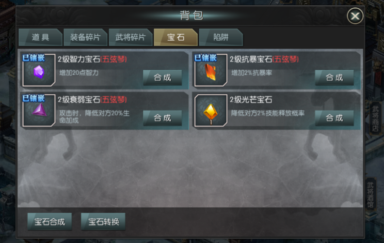 宝石:优先(技能释放属性宝石,攻击宝石,元素宝石,暴击宝石)输出武将的技能一定要每个回合都能释放。