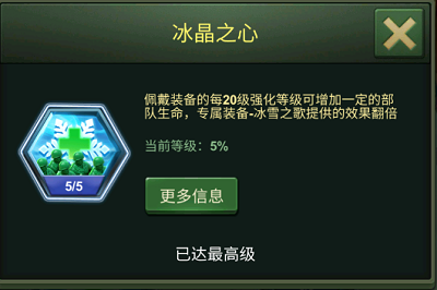 冰晶之心:佩戴装备的每20级强化等级可以增加一定的部队生命(1%-5%),「冰雪之歌」提供的效果翻倍。