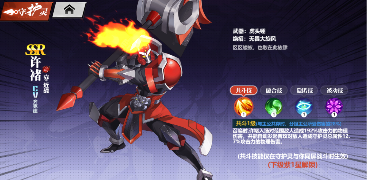 开局最强战力,新手唯一真神,零氪最优选择。许褚的存在为新手玩家们提供了非常优势的开局,免费领取,并且能够不断白嫖碎片,玩家们在升级、推图过程中自然而然就能得到强化的一个守护灵角色。本身作为SSR级别,在各方面的表现来看就很可观了。再加上足够简单的养成路线,最终成就了许褚的超强性价比!肉盾设定,很能抗,在合理的羁绊、技能以及装备搭配下能一路用到底!活着才有输出~