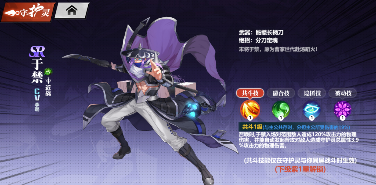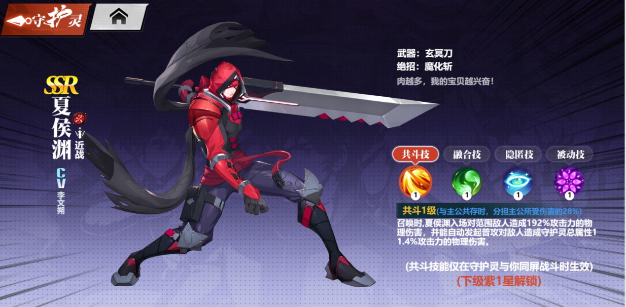 开箱子极易获得的SSR级守护灵,强势的物理输出角色,同时拥有单体和范围高伤害技能,并且可以破霸体,在推图过程中也是一个非常优质的选择。这里推荐选择近战角色的玩家们使用夏侯渊的融合技,属于专业对口的buff加成,让普攻伤害翻倍,瞬间统治战场。