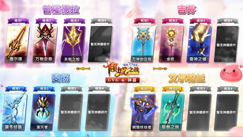 和公会战一样激动人心的要数公会神器了。公会占领给一个主城,便能获得一个固定宝箱,连续两次或以上占领同一主城可以获得两个固定宝箱。打开固定宝箱便能获得该城池对应的武器类型的神器碎片及相关材料。