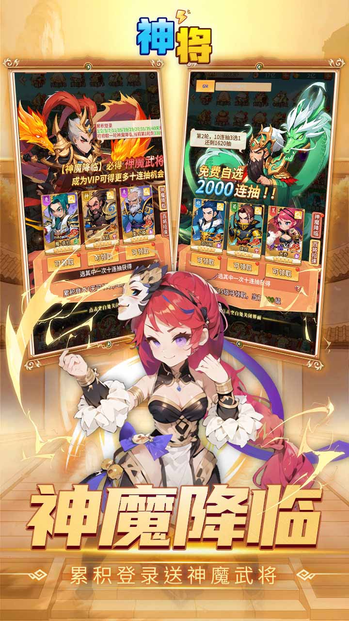 《神将》是一款融合经典三国历史与奇幻元素的0.1折超值卡牌冒险手游,创新融入老虎机抽将玩法与魂将开箱系统,开局即送自选2000连抽,海量福利畅享不停,带你穿越东汉末年,亲手书写乱世传奇!