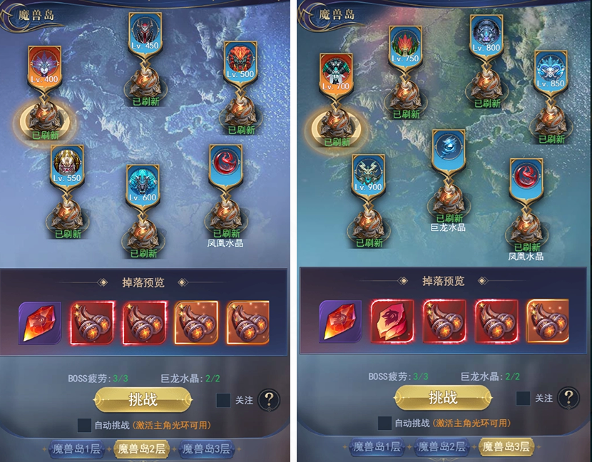 8、击败魔兽岛2、3层B0SS会产生B0SS疲劳,每天上限3点B0SS疲劳值,疲劳值满后击败B0SS不可获得奖励。
