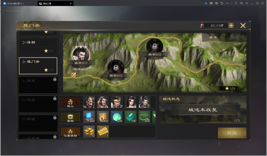1、收复城池是游戏初期主要的经验值来源,并且能获得大量重要道具,在初期都可以轻松三星收复,即使偶尔出现卡关的情况,回去武将界面培养一下也能轻松过关。