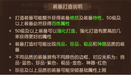 3. 装备打造:50级及以上装备可以强化打造,强化打造有更高的几率获得更好的属性,装备品质分为良品、珍品、极品和神器,珍品及以上的装备可能突破基础属性上线,能有效提升战力,其次后续开放的百炼功能,能有效打造享有多条属性的装备。