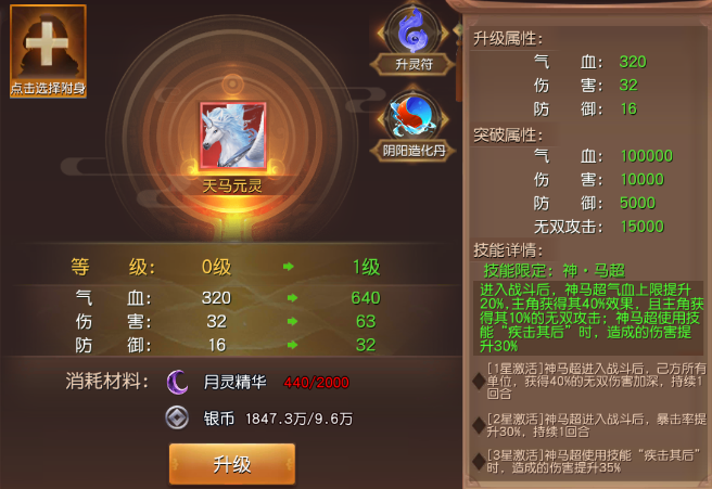 2. 突破:要使用本体武将碎片进行技能升级,武将5星后才能进行突破,他的加成也是10%、10%的往上加的,不能自行选择技能进行突破升级,可以根据自身财力,量力而行