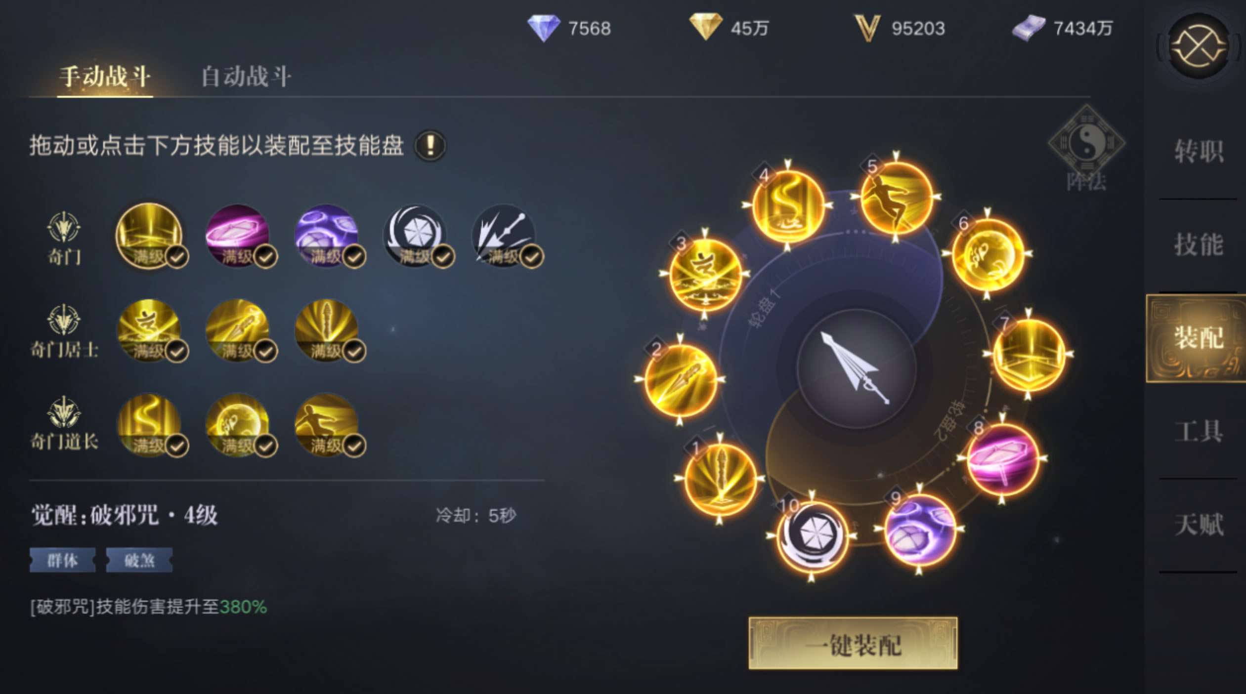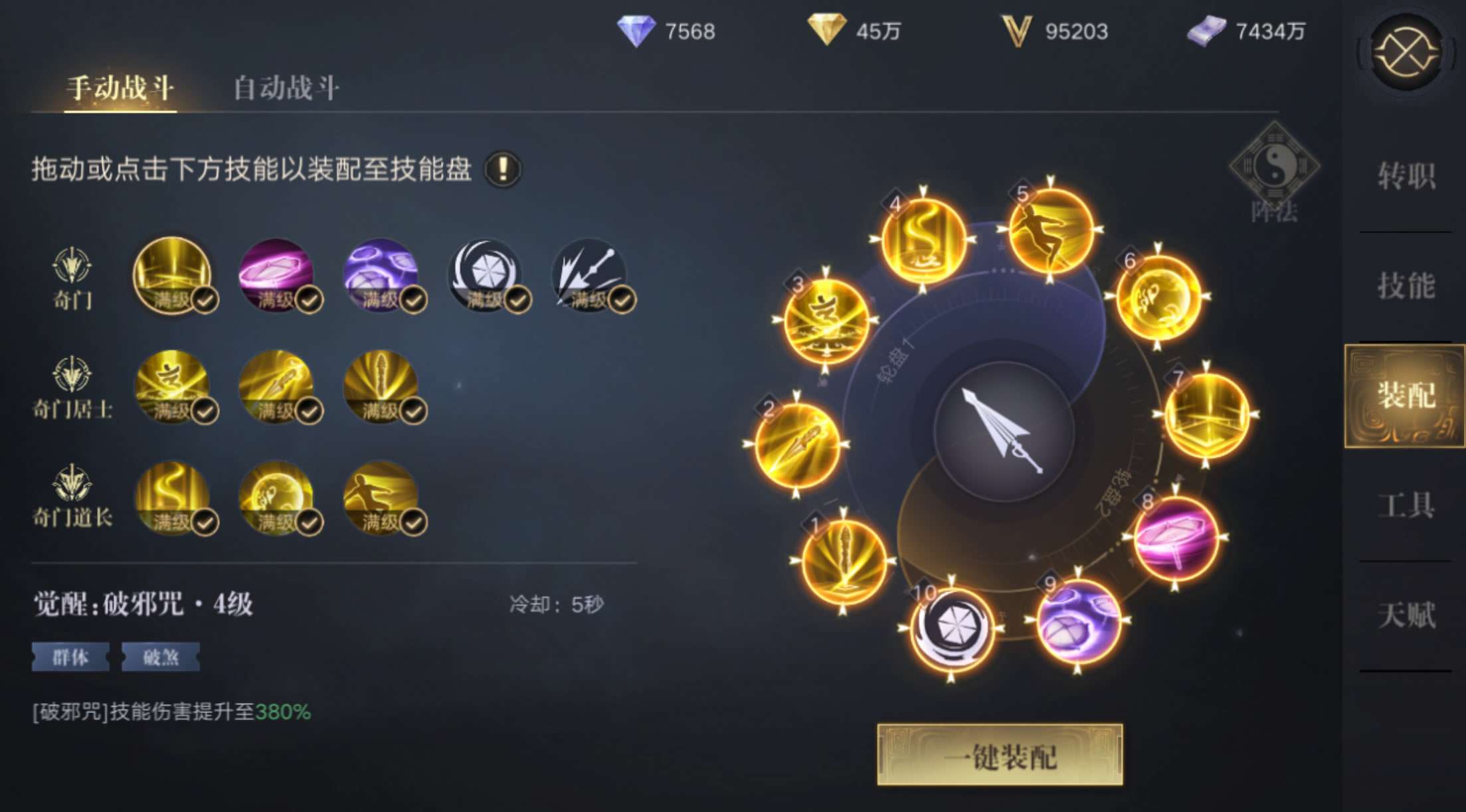 图一:PVE(地宫、围猎、大蛇)的竞技配置为3+1(化金术+太阴杵+萤定+普攻透心杵)这里解释一下,3+1是奇门阵法特有的叫法。“3”指的就是1转的3个技能,无论是打架还是打粽子都是必带技能,所以统称为“3”。“1”指的就是单体普攻技能透心杵了。